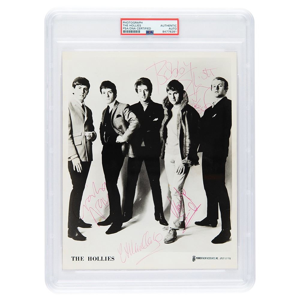 Vintage circa mid-1960s glossy 8 x 10 Premier Talent Associates publicity photo of The Hollies, signed in red ballpoint by Graham Nash, Bobby Elliott, Allan Clarke, Eric Haydock, and Tony Hicks (on the reverse). In fine condition. Encapsulated in a PSA/DNA authentication holder.