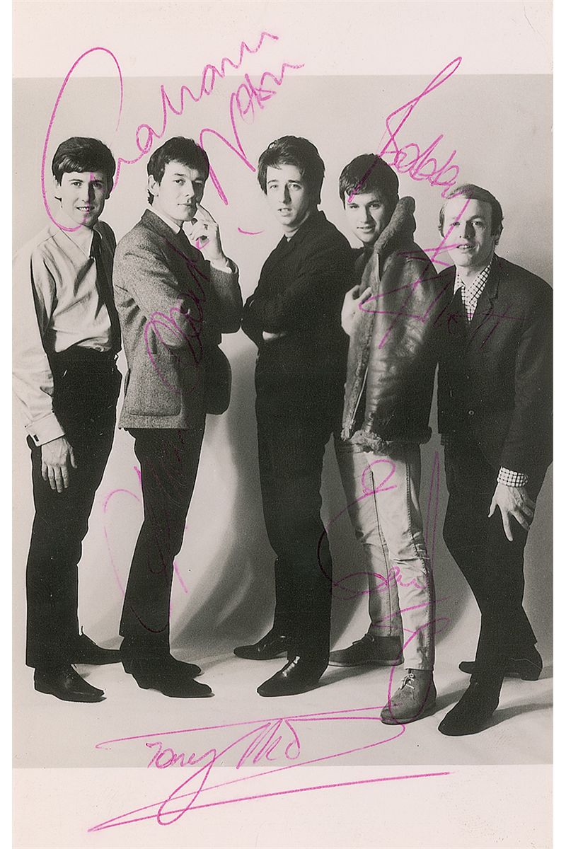 Vintage glossy 3.5 x 5.5 group photo, signed in purple ballpoint by Graham Nash, Allan Clarke, Bobby Elliott, Tony Hicks, and Eric Haydock. Moderate contrast to a couple of signatures, otherwise fine condition. Accompanied by a certificate of authenticity from Tracks.