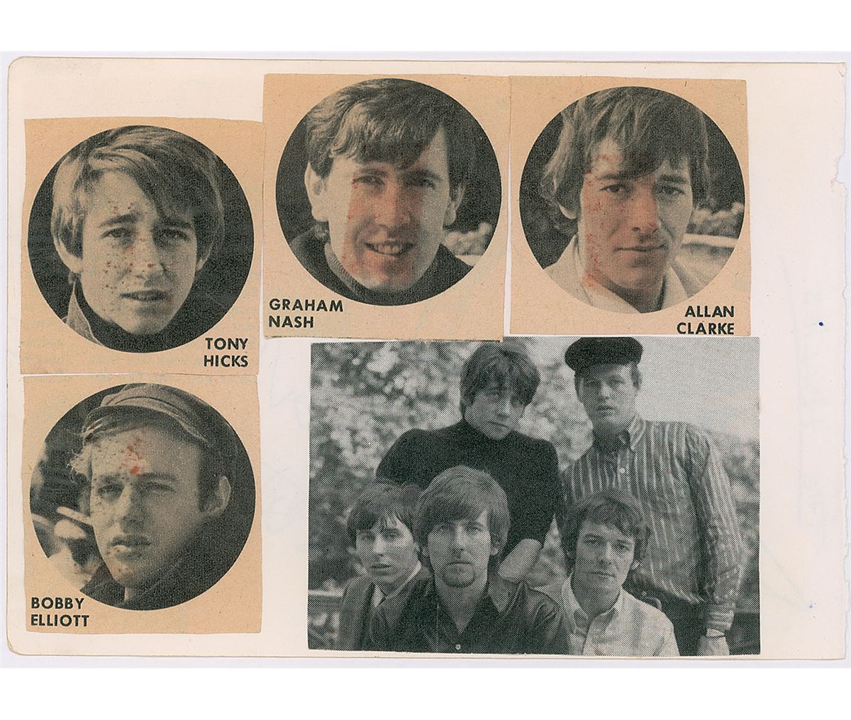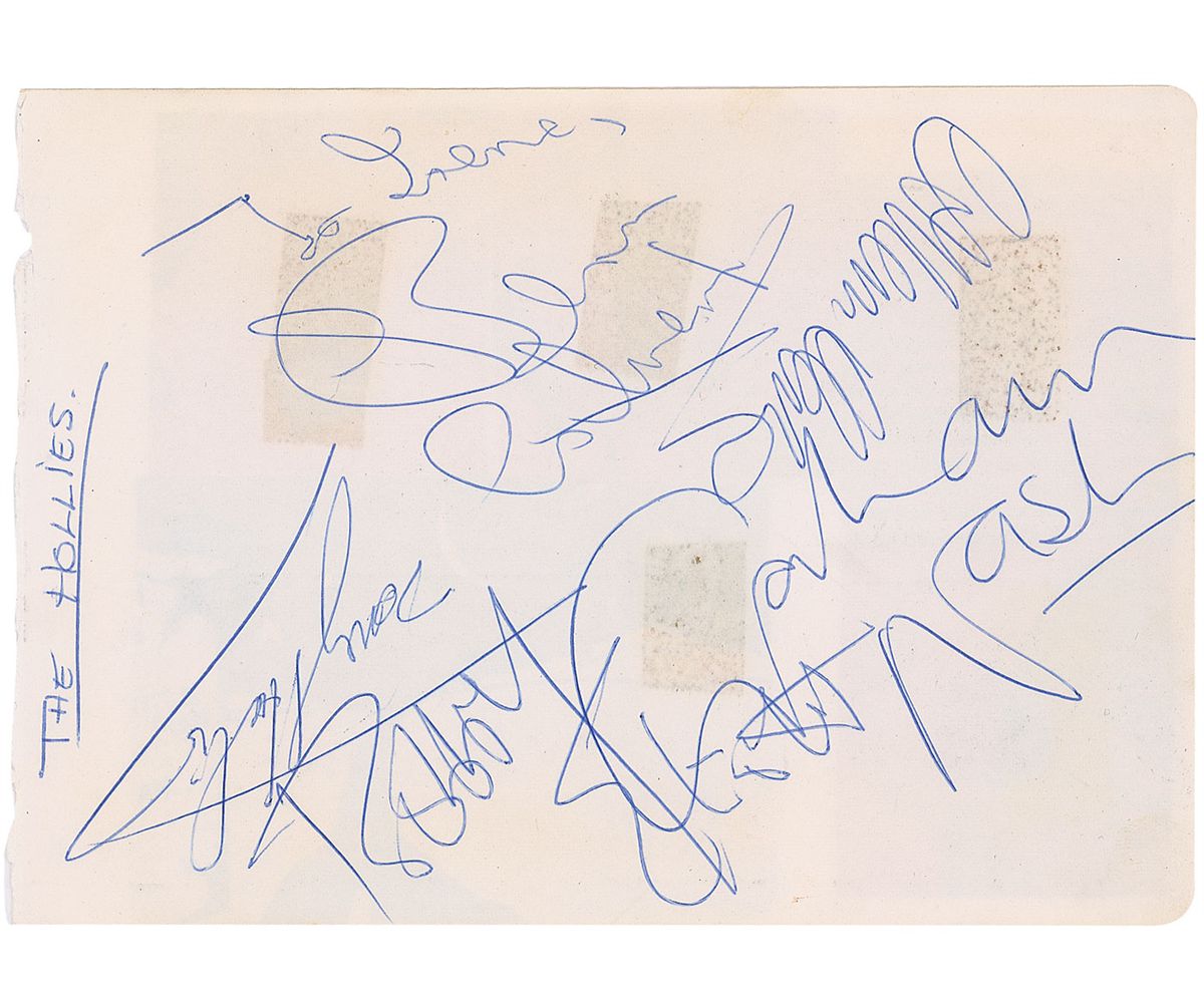 Vintage ballpoint signatures of Graham Nash, Allan Clarke, Bobby Elliott, Tony Hicks, and Bernie Calvert, who has added an inscription to Irene, on an off-white 7 x 5 album page, with five small clipped photos affixed to the reverse and a small collector’s notation along left edge. Small blocks of toning from show-through of tape on reverse, otherwise fine condition. Consignor indicates the original recipient of the signatures was a Decca Records employee.