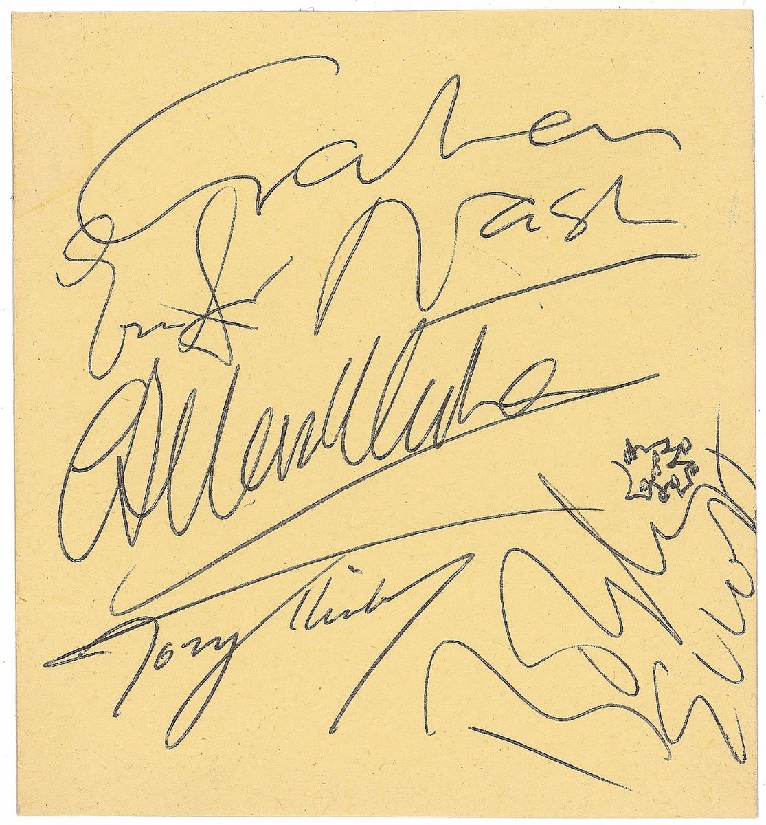 Vintage ballpoint signatures of Graham Nash, Allan Clarke, Eric Haydock, and Bobby Elliott on a yellow 4 x 4.25 card. In fine condition.