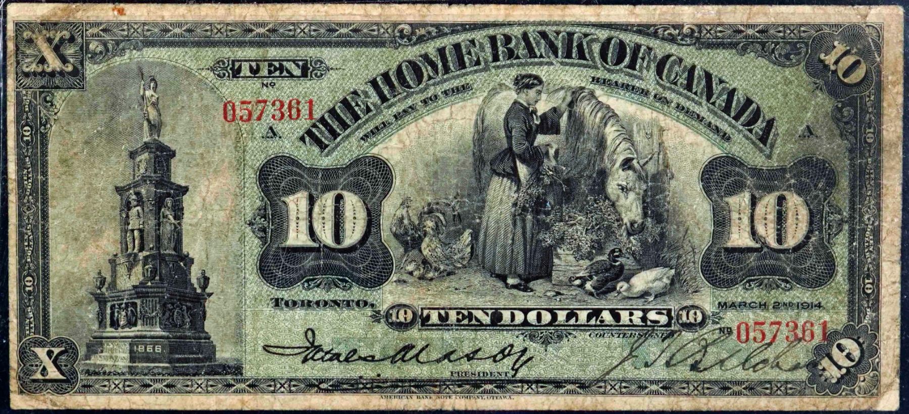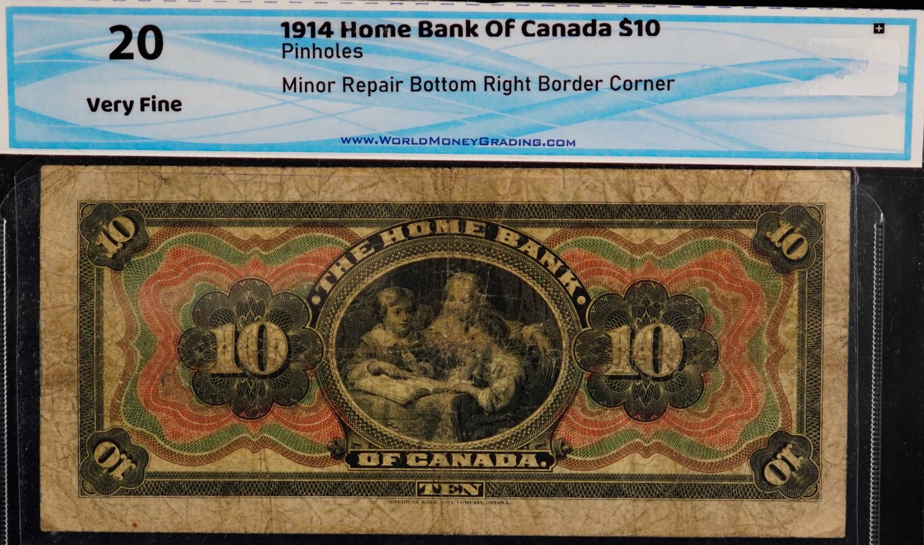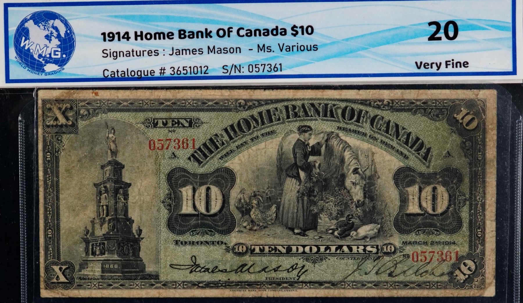 The Home Bank of Canada 1914 $10 #057361 CH-365-10-12 Fine+ (WMG VF-20) Only 4 known examples. Very rare and desirable.