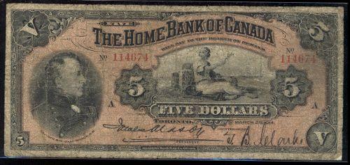 The Home Bank of Canada $5 1914 Serial # 114674 CH-365-10-04. Solid VG example. Rare and seldom offered!