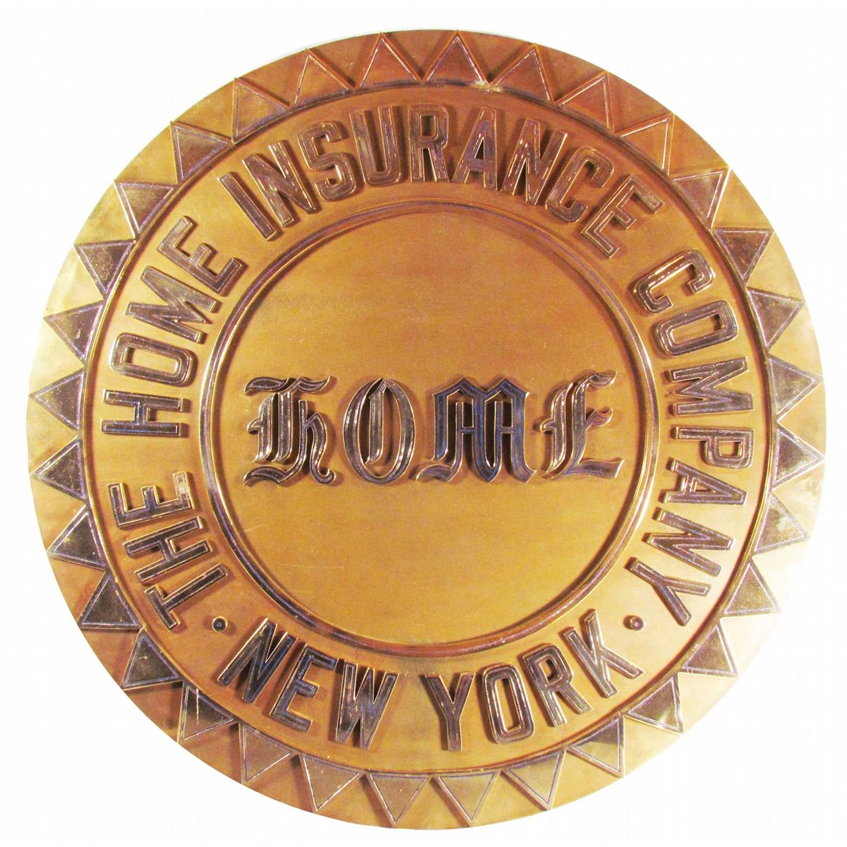 The Home Insurance Company Brass Home Office Outdoor Building Sign. Raised letters. Excellent condition. 36 inch diameter.