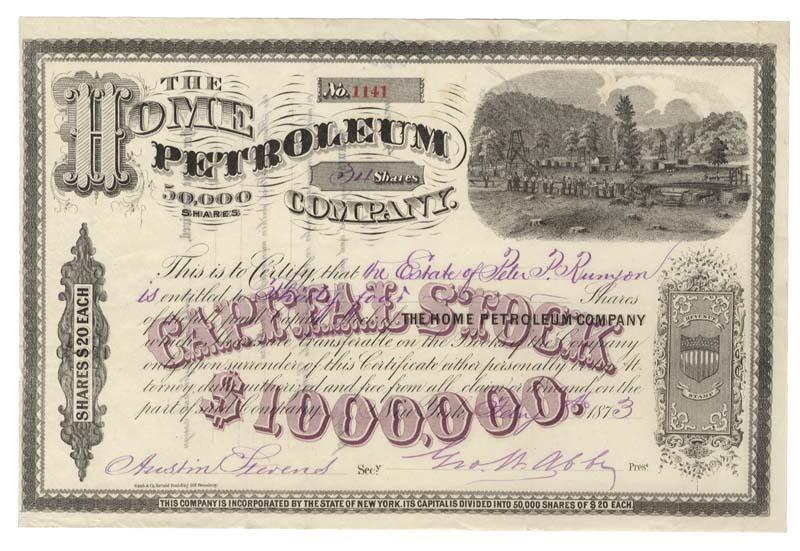 1873, Pennsylvania. Stock certificate for 34 shares. Black with Large Purple Overprint. Litho. Printed by Hatch & Co. Vignette of an Oilfield with derricks, workers and storage tanks. Uncancelled and Very Fine.