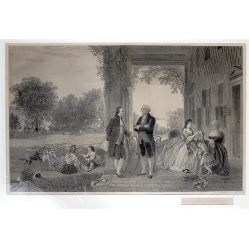<Our item number 126356><B>[Washington, George] The Home of Washington, Engraved by Thomas Oldham Barlow.</B> After a painting by T. P. Rossiter and L. R. Mignot, date unknown (Barlow lived 1824-89), 19¼ x 13½ in. Washington and Lafayette converse on the veranda of Mount Vernon as domestic life goes on around them. Matted and framed to an overall size of 26¼ x 37¾ in. Fine except for one closed tear at lower right corner. <BR>Estimated Value $250 - 350. <BR><BR>Our item number 126356<BR><IMAGES><P ALIGN="CENTER"><IMG SRC="http://www.goldbergcoins.net/liveauction/49jpegs/126356.jpg"> </P></IMAGES>