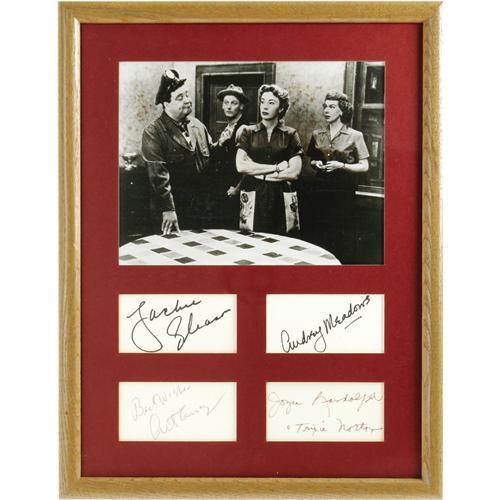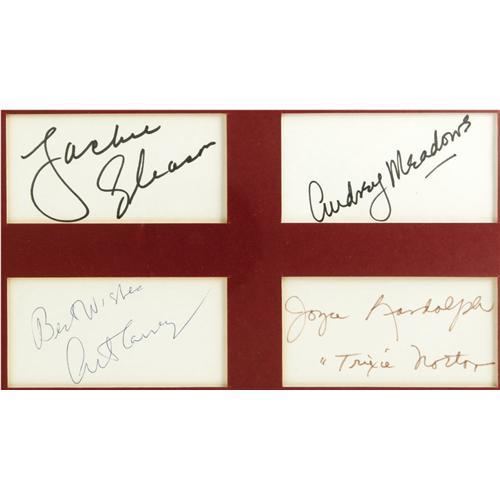 <B>"The Honeymooners" Autograph Display.</B></I> A collection of signatures by <I>Honeymooners</B></I> stars Jackie Gleason, Audrey Meadows, Art Carney, and Joyce Randolph, matted and framed along with a b&w 8" x 10" photo of the cast to an overall size of 13" x 17". In Excellent condition with mild tanning around the edges of the autographs.<BR><BR><b>Shipping:</b> Other (oversized items, group lo (<a target="_blank" href="http://www.heritageauctions.com/common/shipping.php">view shipping information</a>)