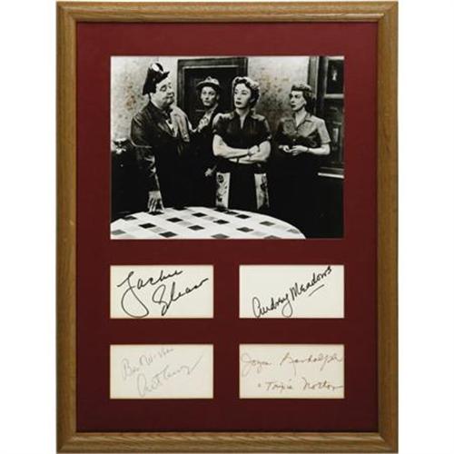 <B>"The Honeymooners" Autograph Display.</B></I> A collection of signatures by <I>Honeymooners</B></I> stars Jackie Gleason, Audrey Meadows, Art Carney, and Joyce Randolph, matted and framed along with a b&w 8" x 10" photo of the cast to an overall size of 13" x 17". In Excellent condition with mild tanning around the edges of the autographs.<BR><BR><b>Shipping:</b> Books & Catalogs (<a target="_blank" href="http://www.heritageauctions.com/common/shipping.php">view shipping information</a>)