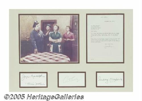 <B>"The Honeymooners" Signature Lot.</B></I> Signature samples from Joyce Randolph, Art Carney, and Audrey Meadows and a typed letter dated December 6, 1956, and signed by Jackie Gleason, matted along with a 5" x 7" color photo of the cast on the set of the classic sitcom. <I>With COA from PSA/DNA.</B></I>