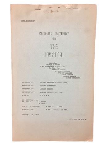 "The Hospital" (1971) from United Artists this is an original script and combined continuity. George C. Scott as Herbert Bock the chief of medicine in a New York teaching hospital, is contemplating suicide, he is impotent, his wife has left him, and his children are not speaking to him. His hospital is also suffering from a recent state of inexplicable deaths. In the midst of these setbacks, Bock is drawn to the much younger women Diane Rigg as Barbara, whose father is a patient. As Barbara restores Bock's will to live, it turns out the hospital deaths are murders. This performance earned George C. Scott a nomination for Best Actor in a leading role, and an Academy Award for best writing. (Approx. 14"x9").