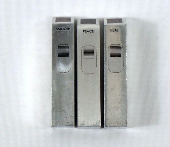From this years hit horror sci-fi film "The Host" about aliens called "Souls" who come to Earth, take over our bodies, then erase our memories. They use human "Seekers" to seek out people to infest, and the seekers carry "sprayers" to control the people, both to keep them "healthy", or to control their moods. These are three screen used hero "sprayers", each for a different emotional purpose: "SMOOTH", "PEACE and "HEAL". The "PEACE" sprayers are also carried by the "Seekers" who are humans programmed to find and seek out new bodies. The spray, as the name implied sedates humans. (Approx. 5" long each).