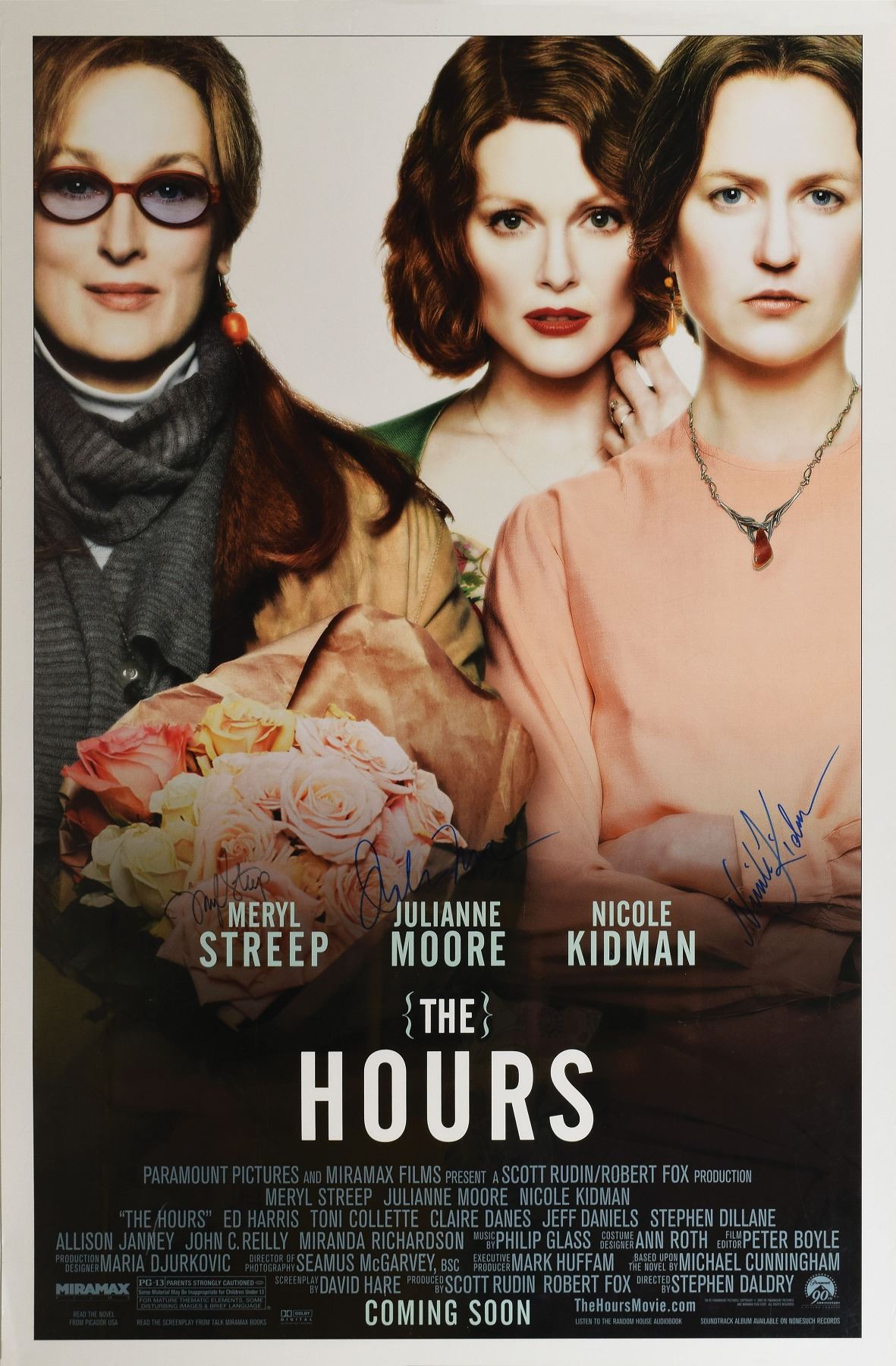 Color 26.75 x 40.75 one-sheet movie poster for the 2002 film The Hours, signed in blue or black felt tip by Meryl Streep, Julianne Moore, and Nicole Kidman. Rolled and in fine condition. Kidman won the Oscar for Best Actress for her portrayal of Virginia Woolf.