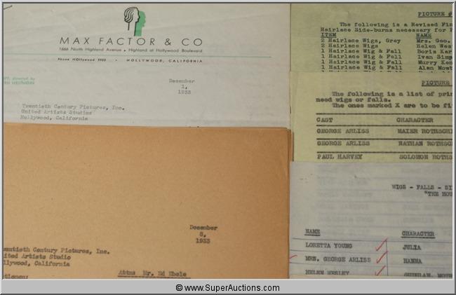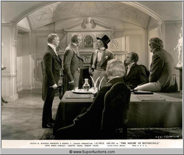 "The House of Rothschild" / Released April 7, 1934 / Twentieth Century Fox Film Corporation / The chronicles of the famous banking family during the Napoleonic Wars / Starring: George Arliss, Loretta Young, Boris Karloff, Robert Young, C. Aubrey Smith, Arthur Byron and Helen Wesley / File includes (22) 8 x 10 Black & White Production Still Photographs photographed by Kenneth Alexander ~ Publication Please Credit 20th Century Pictures, Inc. stamped on the reverse side, (4) 10 x 9 Black & WhitePublicity Photographs, Proposal Rental Wig letter from Max Firestein of Max Factor & Co. with Original Signature to Twentieth Century Pictures, Inc., Various other typed items such as; List of Principal actors, Revised Final Wig Schedule and Wig Purchasing Records