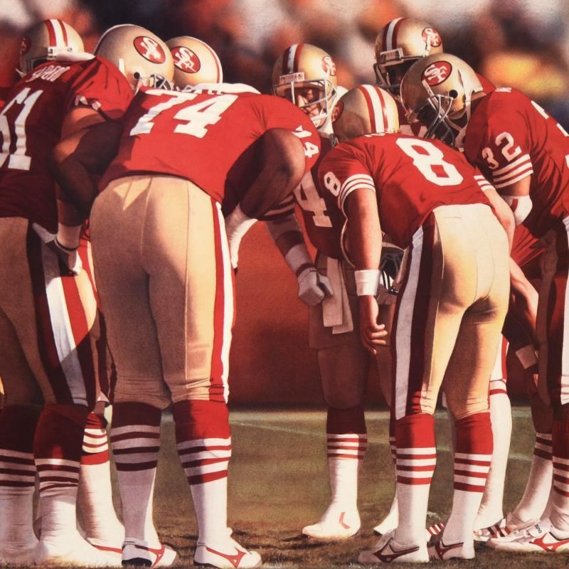 "The Huddle I (49ers & Steve Young)" is a limited edition lithograph on paper dated (1993) by Daniel M. Smith, numbered and hand signed by the artist! Includes Certificate of Authenticity! Measures approx. 24.5" x 20" (with border), 21.5" x 16.5" (image).