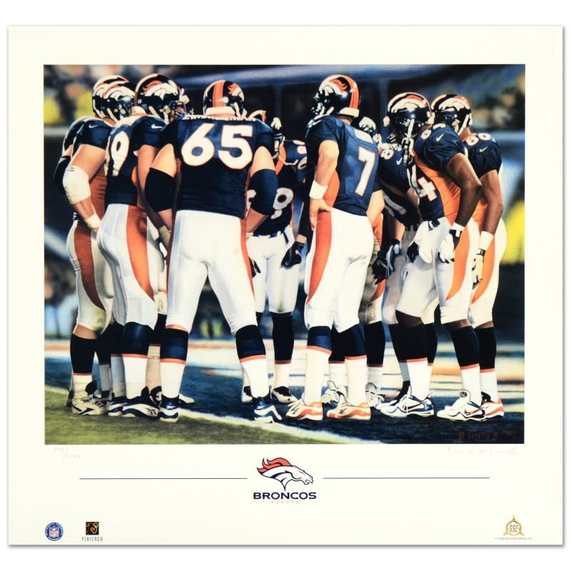 "The Huddle VIII (Broncos)" is a limited edition lithograph on paper dated (1998) by Daniel M. Smith, numbered and hand signed by the artist! Includes Certificate of Authenticity! Measures approx. 22" x 20" (with border), 19" x 14.5" (image).