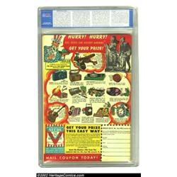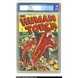 The Human Torch #11 (Timely, 1943) CGC FN 6.0 Off-white to white pages. The bright colors of this Schomburg cover seem to belong with a higher grade, but CGC notes that the centerfold is detached on this book. Early issues of this classic Timely title have steadily appreciated in value in recent years, and CGC has certified a higher grade for this issue on only three other occasions, two factoids to consider before you bid on this baby. Overstreet 2002 FN 6.0 value = $504. Important notice: We expect to be auctioning lots at the rate of 200-250 per hour. Sometimes eBay Premier live bid software cannot keep up with that pace, so we strongly recommend that you place a realistic proxy bid now as insurance to avoid disappointment. Also please note that all Heritage/CAA lots purchased through eBay Premier carry a 20% Buyer's Premium. Please make sure you read the Terms and Conditions.