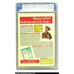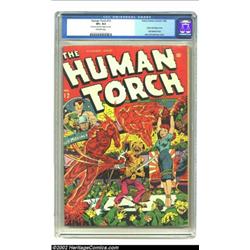 The Human Torch #12 (Timely, 1943) CGC VF+ 8.5 Off-white pages. The Human Torch burns a meanie bad to the bone; the bound, scarlet-tressed, bountiful and barefoot beauty has a new hero; Toro performs an unorthodox tonsillectomy; the Sub-Mariner knocks a knuckleheaded Jap/Nazi duo. It's a classic Schomburg Timely WWII cover! This amazing copy falls a quarter-grade short of being the finest representative of issue #12 that CGC has seen to date. CGC does note "Very minor amount of glue on cover." Overstreet 2002 VF 8.0 value = $1,818; NM 9.4 value = $3,200. Important notice: We expect to be auctioning lots at the rate of 200-250 per hour. Sometimes eBay Premier live bid software cannot keep up with that pace, so we strongly recommend that you place a realistic proxy bid now as insurance to avoid disappointment. Also please note that all Heritage/CAA lots purchased through eBay Premier carry a 20% Buyer's Premium. Please make sure you read the Terms and Conditions.