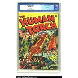 The Human Torch #13 (Timely, 1943) CGC VF/NM 9.0 Off-white pages. See the description for issue #12, and add a snakepit to the Japanese sadists' modus operandi. Yeah, and substitute an ample blond for the supple redhead while keeping the basic Schomburg action gorefest motif intact. Oh, and make the high-grade even higher. This sizzling copy is a full grade better than any other issue #13 that CGC has seen to date. Overstreet 2002 NM 9.4 value = $1,850. Important notice: We expect to be auctioning lots at the rate of 200-250 per hour. Sometimes eBay Premier live bid software cannot keep up with that pace, so we strongly recommend that you place a realistic proxy bid now as insurance to avoid disappointment. Also please note that all Heritage/CAA lots purchased through eBay Premier carry a 20% Buyer's Premium. Please make sure you read the Terms and Conditions.