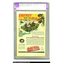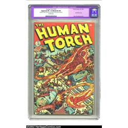The Human Torch #16 (Timely, 1944) CGC Apparent VF- 7.5 Moderate (P) Off-white pages. If you try really, really hard, you can take in the action of about half of this senses-stimulating cover by Alex Schomburg at a time. Sir Alex's mastery of detail, movement, and fireballs was unsurpassed, but goldarn it! You had to look at his covers in sections! This is a supremely attractive copy that testifies to the talents of the professional restoration specialist, whose work here is noted by CGC thusly: "Restoration includes color touch, pieces added, tear seals, cleaned, reinforced", primarily it would appear, along the spine, out of view from the front. Only one unrestored copy has earned a higher grade than Very Fine, and this is far and away the nicest-appearing restored copy of issue #16 that CGC has seen. Overstreet 2002 VF 8.0 value = $738. Important notice: We expect to be auctioning lots at the rate of 200-250 per hour. Sometimes eBay Premier live bid software cannot keep up with that pace, so we strongly recommend that you place a realistic proxy bid now as insurance to avoid disappointment. Also please note that all Heritage/CAA lots purchased through eBay Premier carry a 20% Buyer's Premium. Please make sure you read the Terms and Conditions.