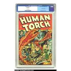 The Human Torch #19 (Timely, 1945) CGC VF 8.0 Off-white pages. The Torch and Toro fly to the rescue of a beautiful damsel in distress, suspended in bondage, with evil-doers being burned by molten metal -- it's clear that this spectacular Alex Schomburg cover has all the elements to make it a favorite of Schomburg fans and Timely collectors. Plus the Sub-Mariner gets his face in a circle on the cover, with a story inside. You can be sure that this is a lovely vintage comic, with no major flaws. Overstreet 2003 VF 8.0 value = $763. Important notice: Heritage usually auctions material at the rate of 200-250 lots per hour. On some occasions eBay Live bid software or the Internet may not be able to keep up with the pace of the auction. We recommend placing a realistic absentee bid now as insurance to avoid disappointment. Occasionally the auctioneer may eliminate or reject an eBay Live bid, and the auctioneer may also reopen a lot after the close of the eBay live bidding (usually because we missed an audience bid), and may reject your bid even if it shows you as the winning bidder. By bidding via eBay Live, you agree that Heritage may award the lot to another bidder at its sole discretion under the circumstances described above or any other reasonable circumstances. Also please note that all Heritage lots purchased through eBay Live carry a 20% Buyer's Premium. Please make sure you read the Terms and Conditions before you bid.