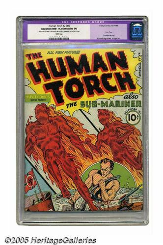 <B>The Human Torch #2 (#1) (Timely, 1940) CGC Apparent NM- 9.2 Extensive (P) White pages.</B></I> One of the most sought-after Timely keys, this comic is ranked among the 25 most valuable comic books of all by Overstreet. The main event is the first appearance of Toro, the Human Torch's sidekick who would appear at the Torch's side on many a cover and in many a story in the ensuing years. By the way, Toro wasn't an android like the Torch, but one of the first mutant superheroes! The book's cover by Alex Schomburg offers not only the fiery duo but also Timely' s other VIP of the day, the Sub-Mariner. It's interesting to note that the heroes were already taking on the Nazi menace in this Fall 1940 issue, more than a year before the U.S. would actually enter the war. The roster of interior artists includes Timely's top talents of the day: Carl Burgos, Bill Everett, Joe Simon, and Paul Reinman to name a few. CGC notes, "Restoration includes: color touch, pieces added, tear seals, cleaned, reinforced." Overstreet 2005 GD 2.0 value = $2,875; VG 4.0 value = $5,750; FN 6.0 value = $8,625; VF 8.0 value = $21,600; VF/NM 9.0 value = $35,800; NM- 9.2 value = $ 50,000.