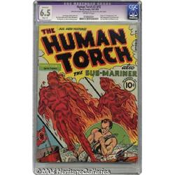 <B>The Human Torch #2 (#1) (Timely, 1940) CGC Apparent FN+ 6.5 Slight (P) Off-white pages.</B></I> Timely at its mightiest, with the Human Torch and Sub-Mariner making their first comic book appearance in a title other than <B>Marvel Comics</B></I>/<B>Marvel Mystery Comics</B></I>. The restoration here is slight and professionally rendered. CGC notes, "Restoration includes: small amount of color touch on cover, cover cleaned." CGC's census lists just five unrestored copies with higher grades than FN+ 6.5. Overstreet 2004 GD 2.0 value = $2,750; VG 4.0 value = $5,500; FN 6.0 value = $8,250; VF 8.0 value = $20,800. <BR><BR><B>Important notice:</B> Heritage usually auctions material at the rate of 200-250 lots per hour. On some occasions eBay Live bid software or the Internet may not be able to keep up with the pace of the auction. We recommend placing a realistic absentee bid now as insurance to avoid disappointment. Occasionally the auctioneer may eliminate or reject an eBay Live bid, and the auctioneer may also reopen a lot after the close of the eBay live bidding (usually because we missed an audience bid), and may reject your bid even if it shows you as the winning bidder. By bidding via eBay Live, you agree that Heritage may award the lot to another bidder at its sole discretion under the circumstances described above or any other reasonable circumstances. Since eBay bids are not shown to us until we open the lot on the floor, we treat those bids just like floor bids. In most cases the floor responds before the eBay bid is presented to us, due to Internet lag time, so for consistency we have made it a policy that floor bids are always considered first over tie eBay live bids. Also please note that all Heritage lots purchased through eBay Live carry a 20% Buyer's Premium. Please make sure you read the Terms and Conditions before you bid.