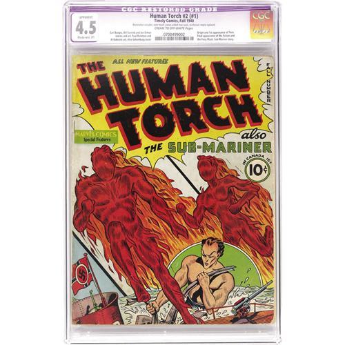 <B>The Human Torch #2 (#1) (Timely, 1940) CGC Apparent VG+ 4.5 Moderate (P) Cream to off-white pages.</B></I> This key issue, one of the top twenty Golden Age Comics as listed by Overstreet, is a book no serious collector of Timely titles can be without. The Human Torch was the very first Marvel Comics star, and this first solo comic features the introduction of Torch's red-hot sidekick, Toro; a Sub-Mariner story; plus the final appearances of the Falcon and the Fiery Mask. Artists for this landmark issue include Alex Schomburg (cover), Carl Burgos, Bill Everett, Joe Simon, and more. It all adds up to the third most desirable Timely, after <B>Marvel Comics</B></I> #1 and <B>Captain America Comics</B></I> #1. The restoration work on this attractive mid-grade copy is nicely done, leaving a comic that will make the next owner proud to display it. CGC notes, "Restoration includes: color touch, pieces added, tear seals, reinforced, staple replaced." Overstreet 2006 GD 2.0 value = $2,933; VG 4.0 value = $5,866. <BR><BR><B>Important notice:</B> Heritage usually auctions material at the rate of 200-250 lots per hour. On some occasions eBay Live bid software or the Internet may not be able to keep up with the pace of the auction. We recommend placing a realistic absentee bid now as insurance to avoid disappointment. Occasionally the auctioneer may eliminate or reject an eBay Live bid, and the auctioneer may also reopen a lot after the close of the eBay live bidding (usually because we missed an audience bid), and may reject your bid even if it shows you as the winning bidder. By bidding via eBay Live, you agree that Heritage may award the lot to another bidder at its sole discretion under the circumstances described above or any other reasonable circumstances. Since eBay bids are not shown to us until we open the lot on the floor, we treat those bids just like floor bids. In most cases the floor responds before the eBay bid is presented to us, due to Internet lag time, so for consistency we have made it a policy that floor bids are always considered first over tie eBay live bids. Also please note that all Heritage lots purchased through eBay Live carry a 22.5% Buyer's Premium. Please make sure you read the Terms and Conditions before you bid. This lot is being auctioned in conjunction with a live floor auction by Heritage Auction Galleries. All final auction and invoice information will be supplied by Heritage Auction Galleries, and all other information should be considered preliminary. Lot:41001 <BR><BR><B>Winning Notification and Billing:</B> After the FINAL session in this auction is complete, Heritage will send e-mail and snail mail invoices. This process normally takes several days. All final auction and invoice information will be supplied by Heritage Auction Galleries, and all other information should be considered preliminary. <BR><BR>This auction will be conducted on a live auction floor and over the Internet through eBay Live. If you choose to place an absentee bid, please take a moment to <font color='#0000ff'><u><a href='http://pages.ebay.com/liveauctions/help/before/laabsentee.html'>learn how eBay Live absentee bidding works</a></u></font><font color='#000000'>