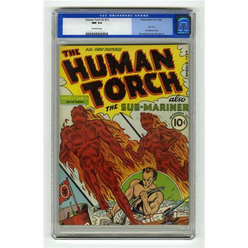 <B>The Human Torch #2 (#1) (Timely, 1940) CGC NM 9.4 Off-white pages.</B></I> This is the finest copy yet certified of this hotly sought-after Timely key. Our copy's alone at the top of the CGC census, and the blue "Universal" CGC label signifying an unrestored copy is especially notable, since the few copies that come along seem to be restored more often than not. While the title character was already a known quantity from <B>Marvel Mystery Comics</B></I>, this issue is particularly significant in that it's got the first appearance of his fiery sidekick Toro. Unlike the Human Torch, who was an android, Toro was born with his powers, making him one of the very first mutant superheroes! The issue moved up in the 2005 Overstreet ranking of the most valuable comic books, going from 21st to 18th, and the only Timelys above it on that list are <B>Marvel Comics</B></I> #1 and <B>Captain America Comics</B></I> #1. Also appearing in this issue is the only other Timely star who approached the Human Torch's popularity, namely the Sub-Mariner (Captain America hadn't been created yet). This first cover appearance is also the work of Timely's cover ace Alex Schomburg. The roster of interior artists includes Timely's top talents of the day: Carl Burgos, Bill Everett, Joe Simon, and Paul Reinman to name a few. As for the unusual numbering: the issue doesn't have any number on the cover, and though this is the first issue of the series, the indicia read #2 because Timely opted to continue the numbering from <B>Red Raven Comics</B></I> #1. This copy will be an object of desire for anyone who collects the Timely/Marvel line, and that includes just about every comic book fan! Overstreet 2005 NM- 9.2 value = $50,000. CGC census 11/05: 1 in 9.4, none higher.