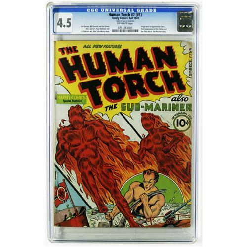 <B>The Human Torch #2 (#1) (Timely, 1940) CGC VG+ 4.5 Off-white pages.</B></I> The first appearance of Toro highlights this debut issue of the Torch's own title. This is the third most valuable Timely comic, behind only <B>Marvel Comics</B></I> #1 and <B>Captain America Comics</B></I> #1. The book's got an Alex Schomburg cover, with interior art by Carl Burgos, Bill Everett, Joe Simon, and more. CGC notes, "1 piece of tape on centerfold." Overstreet 2005 VG 4.0 value = $5,750. CGC census 12/05: 5 in 4.5, 13 higher.