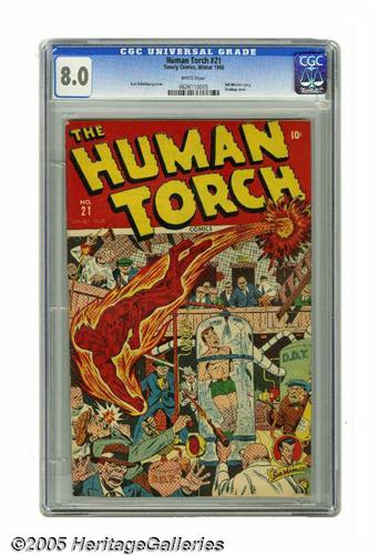 <B>The Human Torch #21 (Timely, 1945) CGC VF 8.0 White pages.</B></I> Terrific Alex Schomburg cover - aren't they all? - is the spotlight of this issue, which features a Sub-Mariner story. Pretty copy looks better than the assigned grade from CGC, but close inspection reveals just enough wear along the spine, albeit minor, to keep certification at "only" VF 8.0, still the second highest-graded copy in CGC's census. Overstreet 2005 VF 8.0 value = $744. CGC census 7/05: 1 in 8.0, 1 higher.