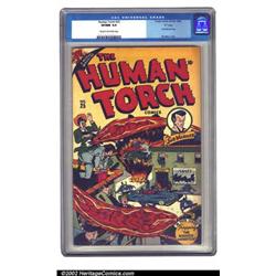 The Human Torch #25 "D" pedigree (Timely, 1946) CGC VF/NM 9.0 Cream to off-white pages. Sol Brodsky provided fury and excitement as the Human Torch and Toro try to foil the Diamond Mart robbery. The crooks seem to have the upper hand, gunning down cops left and right and blowing the squad car to heck--but not for long, once the fiery duo get their hands on them. Also appearing inside this issue is the ever popular Sub-Mariner. Like most of the comics from the "D" collection, this fresh-looking copy has excellent cover colors and a tight, flat appearance. According to the CGC census this is the best copy they have graded, with the runners-up only coming in at VF 8.0. Overstreet 2002 NM 9.4 value = $1,175. Important notice: We expect to be auctioning lots at the rate of 200-250 per hour. Sometimes eBay Premier live bid software cannot keep up with that pace, so we strongly recommend that you place a realistic proxy bid now as insurance to avoid disappointment. Also please note that all Heritage/CAA lots purchased through eBay Premier carry a 20% Buyer's Premium. Please make sure you read the Terms and Conditions.