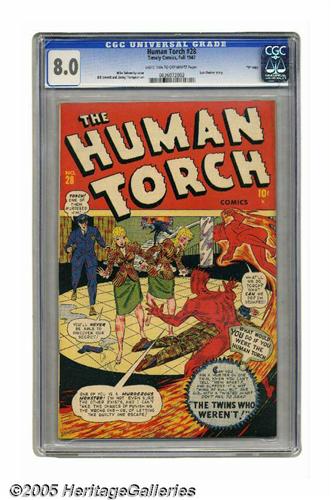 <B>The Human Torch #28 "D" Copy pedigree (Timely, 1947) CGC VF 8.0 Light tan to off-white pages.</B></I> Two beautiful women, identical twins -- which one is the killer? Book 'em both, Torch! Mike Sekowsky drew this murder-mystery cover; Bill Everett and Jimmy Thompson get credit for the interior art chores. This beauty of a copy looks sharp and sweet, with only a hint of a dust shadow along the outside edge reminding us that this book is close to sixty years old! Overstreet 2005 VF 8.0 value = $744. CGC census 7/05: 1 in 8.0, 2 higher.