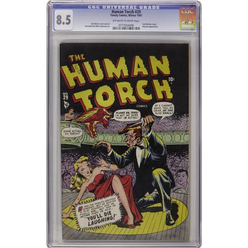 <B>The Human Torch #29 (Timely, 1947) CGC VF+ 8.5 Off-white to white pages.</B></I> This impressive copy is just below the highest grade CGC has given yet for the issue, which has a Syd Shores cover with Ken Bald and Mike Sekowsky interior art. Also inside is a Sub-Mariner story with a Namora (<I>yess!</B></I>) appearance. Overstreet 2006 VF 8.0 value = $775; VF/NM 9.0 value = $1,225. CGC census 10/06: 3 in 8.5, 1 higher.<BR><BR><b>Shipping:</b> Slabbed Comic (<a target="_blank" href="http://www.heritageauctions.com/common/shipping.php">view shipping information</a>)