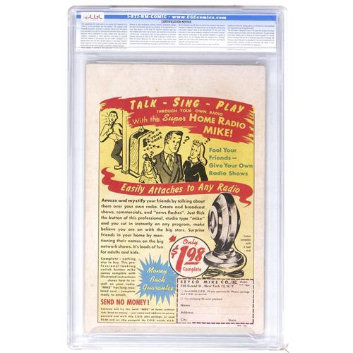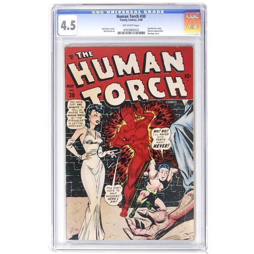 <B>The Human Torch #30 (Timely, 1948) CGC VG+ 4.5 Off-white pages.</B></I> Syd Shores cover. Sub-Mariner backup feature with Bill Everett art. Overstreet 2006 VG 4.0 value = $248. CGC census 6/06: 1 in 4.5, 6 higher. <BR><BR><B>Important notice:</B> Heritage usually auctions material at the rate of 200-250 lots per hour. On some occasions eBay Live bid software or the Internet may not be able to keep up with the pace of the auction. We recommend placing a realistic absentee bid now as insurance to avoid disappointment. Occasionally the auctioneer may eliminate or reject an eBay Live bid, and the auctioneer may also reopen a lot after the close of the eBay live bidding (usually because we missed an audience bid), and may reject your bid even if it shows you as the winning bidder. By bidding via eBay Live, you agree that Heritage may award the lot to another bidder at its sole discretion under the circumstances described above or any other reasonable circumstances. Since eBay bids are not shown to us until we open the lot on the floor, we treat those bids just like floor bids. In most cases the floor responds before the eBay bid is presented to us, due to Internet lag time, so for consistency we have made it a policy that floor bids are always considered first over tie eBay live bids. Also please note that all Heritage lots purchased through eBay Live carry a 22.5% Buyer's Premium. Please make sure you read the Terms and Conditions before you bid. This lot is being auctioned in conjunction with a live floor auction by Heritage Auction Galleries. All final auction and invoice information will be supplied by Heritage Auction Galleries, and all other information should be considered preliminary. Lot:41001 <BR><BR><B>Winning Notification and Billing:</B> After the FINAL session in this auction is complete, Heritage will send e-mail and snail mail invoices. This process normally takes several days. All final auction and invoice information will be supplied by Heritage Auction Galleries, and all other information should be considered preliminary. <BR><BR>This auction will be conducted on a live auction floor and over the Internet through eBay Live. If you choose to place an absentee bid, please take a moment to <font color='#0000ff'><u><a href='http://pages.ebay.com/liveauctions/help/before/laabsentee.html'>learn how eBay Live absentee bidding works</a></u></font><font color='#000000'>