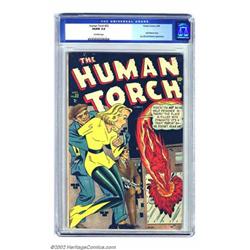 The Human Torch #32 (Timely, 1948) CGC VG/FN 5.0 Off-white pages. Sun Girl makes one of her rare cover appearances on this classic issue. Namora and Sub-Mariner are also featured in this Golden Age gem. These later issues seem to be getting scarcer and scarcer; don't miss out on this rare chance to own a copy. Overstreet 2002 GD 2.0 value = $91; FN 6.0 value = $273. Important notice: We expect to be auctioning lots at the rate of 200-250 per hour. Sometimes eBay Premier live bid software cannot keep up with that pace, so we strongly recommend that you place a realistic proxy bid now as insurance to avoid disappointment. Also please note that all Heritage/CAA lots purchased through eBay Premier carry a 20% Buyer's Premium. Please make sure you read the Terms and Conditions.