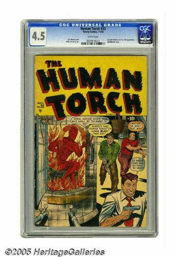 <B>The Human Torch #33 (Timely, 1948) CGC VG+ 4.5 White pages.</B></I> Syd Shores cover. Mike Sekowsky art. Sun Girl and Captain America appear in a Human Torch story. Sub-Mariner backup feature. Overstreet 2005 VG 4.0 value = $212. CGC census 6/05: 1 in 4.5, 2 higher.
