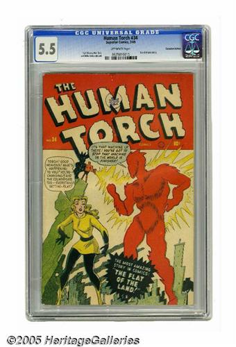 <B>The Human Torch #34 Canadian Edition (Superior, 1949) CGC FN- 5.5 Off-white pages.</B></I> Sun Girl solo story. Artists include Mike Sekowsky, Ken Bald, and Syd Shores. The U.S. edition of #34 has a 2005 Overstreet FN 6.0 value of (American edition) = $276. This Canadian edition not listed in Overstreet. CGC census 7/05 (for the Canadian edition): 1 in 5.5, 1 higher.
