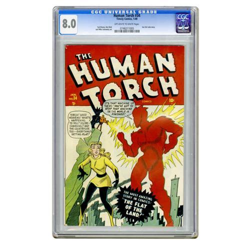 <B>The Human Torch #34 (Timely, 1949) CGC VF 8.0 Off-white to white pages.</B></I> This issue presents the kind of wild cover story we would expect from DC's Silver Age <B>Strange Adventures</B></I>, in "The Flat of the Land." Sun Girl is featured in a solo tale. Syd Shores, Mike Sekowsky, and Ken Bald are listed as artists. Overstreet 2005 VF 8.0 value = $575. CGC census 11/05: 2 in 8.0, none higher.