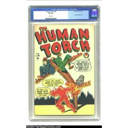 The Human Torch #35 (Timely, 1949) CGC VF 8.0 White pages. The mostly white background of this final issue of the Timely run (the title would re-emerge in 1954 for three issues) would make even a common issue from fifty-plus years ago very difficult to find, but as we have indicated in previous descriptions, virtually no Near Mint copies of these late 1940s Timelys can be found. CGC has graded just three of this issue, and this one has earned the highest grade so far. Captain America makes an appearance in this issue. Overstreet 2002 VF 8.0 value = $568 Important notice: We expect to be auctioning lots at the rate of 200-250 per hour. Sometimes eBay Premier live bid software cannot keep up with that pace, so we strongly recommend that you place a realistic proxy bid now as insurance to avoid disappointment. Also please note that all Heritage/CAA lots purchased through eBay Premier carry a 20% Buyer's Premium. Please make sure you read the Terms and Conditions.