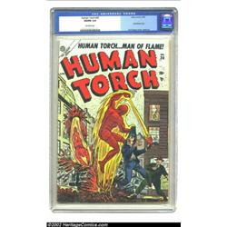 The Human Torch #36 (Timely, 1954) CGC VG/FN 5.0 Off-white pages. This Gerber "uncommon" issue marked the Human Torch's return to his own mag after a hiatus of some five years. Timely Golden Age mainstay Carl Burgos who introduced the character in Marvel Comics #1, but had never drawn a cover assignment for this title and had pretty much abandoned comic books since 1942, finally gets cover duties with this issue. A good-looking book for this grade, it just has evenly distributed signs of wear, but well-preserved cover colors. And only one other copy of issue #36, at Fine Plus, has scored a higher grade from CGC. Overstreet 2002 GD 2.0 value = $84; FN 6.0 value = $252. Important notice: We expect to be auctioning lots at the rate of 200-250 per hour. Sometimes eBay Premier live bid software cannot keep up with that pace, so we strongly recommend that you place a realistic proxy bid now as insurance to avoid disappointment. Also please note that all Heritage/CAA lots purchased through eBay Premier carry a 20% Buyer's Premium. Please make sure you read the Terms and Conditions.