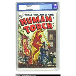 The Human Torch #36 (Timely, 1954) CGC VG/FN 5.0 Off-white pages. This Gerber "uncommon" issue marked the Human Torch's return to his own mag after a hiatus of some five years. Timely's Golden Age mainstay Carl Burgos, who introduced the character in Marvel Comics #1, but had pretty much abandoned comic books since 1942, finally gets cover duties with this issue -- he had never before drawn a cover assignment for this title. A good-looking book for this grade, it just has evenly distributed signs of wear, but well-preserved cover colors. It's the highest ranking of just two unrestored copies of this issue which CGC has certified, to date. This comes with the Certificate of Authenticity of the White Rose Collection. Overstreet 2003 VG 4.0 value = $170; FN 6.0 value = $255. Important notice: Heritage usually auctions material at the rate of 200-250 lots per hour. On some occasions eBay Live bid software or the Internet may not be able to keep up with the pace of the auction. We recommend placing a realistic absentee bid now as insurance to avoid disappointment. Occasionally the auctioneer may eliminate or reject an eBay Live bid, and the auctioneer may also reopen a lot after the close of the eBay live bidding (usually because we missed an audience bid), and may reject your bid even if it shows you as the winning bidder. By bidding via eBay Live, you agree that Heritage may award the lot to another bidder at its sole discretion under the circumstances described above or any other reasonable circumstances. Also please note that all Heritage lots purchased through eBay Live carry a 20% Buyer's Premium. Please make sure you read the Terms and Conditions before you bid.