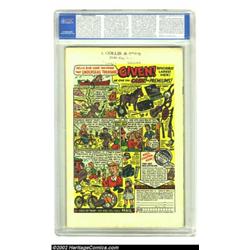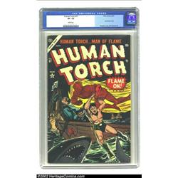 The Human Torch #37 (Timely, 1954) CGC VF- 7.5 White pages. These Atlas issues from the mid-fifties can be at least as difficult to find as their earlier Timely counterparts. Only one other copy of issue #37 has graded out higher than this book, and by only a half-grade. Sol Brodsky provides the Commie-fighting cover, and Bill Everett provides interior art. Overstreet 2002 VF 8.0 value = $525. Important notice: We expect to be auctioning lots at the rate of 200-250 per hour. Sometimes eBay Premier live bid software cannot keep up with that pace, so we strongly recommend that you place a realistic proxy bid now as insurance to avoid disappointment. Also please note that all Heritage/CAA lots purchased through eBay Premier carry a 20% Buyer's Premium. Please make sure you read the Terms and Conditions.