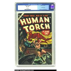 The Human Torch #37 (Timely, 1954) CGC VF- 7.5 White pages. These Atlas issues from the mid-fifties can be at least as difficult to find as their earlier Timely counterparts. Only one other copy of issue #37 has graded higher than this book, and by only a half-grade. Sol Brodsky provides the Commie-fighting cover, and Bill Everett provides interior art. This comes with the Certificate of Authenticity of the White Rose Collection. Overstreet 2003 VF 8.0 value = $531. Important notice: Heritage usually auctions material at the rate of 200-250 lots per hour. On some occasions eBay Live bid software or the Internet may not be able to keep up with the pace of the auction. We recommend placing a realistic absentee bid now as insurance to avoid disappointment. Occasionally the auctioneer may eliminate or reject an eBay Live bid, and the auctioneer may also reopen a lot after the close of the eBay live bidding (usually because we missed an audience bid), and may reject your bid even if it shows you as the winning bidder. By bidding via eBay Live, you agree that Heritage may award the lot to another bidder at its sole discretion under the circumstances described above or any other reasonable circumstances. Also please note that all Heritage lots purchased through eBay Live carry a 20% Buyer's Premium. Please make sure you read the Terms and Conditions before you bid.