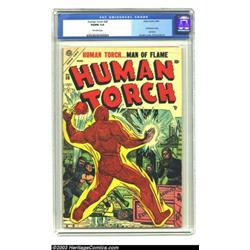 The Human Torch #38 (Timely, 1954) CGC VG/FN 5.0 Off-white pages. The three-issue revival of this Timely Golden Age superhero ended with this issue. The next Human Torch would be a vastly different character and would not arrive on the scene for several more years, until Johnny Storm makes his debut as a founding member of the Fantastic Four. Sol Brodsky and Bill Everett give us cover and interior art, respectively. This is a solid copy of a hard-to-find issue. This comes with the Certificate of Authenticity of the White Rose Collection. Overstreet 2003 VG 4.0 value = $170; FN 6.0 value = $255. Important notice: Heritage usually auctions material at the rate of 200-250 lots per hour. On some occasions eBay Live bid software or the Internet may not be able to keep up with the pace of the auction. We recommend placing a realistic absentee bid now as insurance to avoid disappointment. Occasionally the auctioneer may eliminate or reject an eBay Live bid, and the auctioneer may also reopen a lot after the close of the eBay live bidding (usually because we missed an audience bid), and may reject your bid even if it shows you as the winning bidder. By bidding via eBay Live, you agree that Heritage may award the lot to another bidder at its sole discretion under the circumstances described above or any other reasonable circumstances. Also please note that all Heritage lots purchased through eBay Live carry a 20% Buyer's Premium. Please make sure you read the Terms and Conditions before you bid.