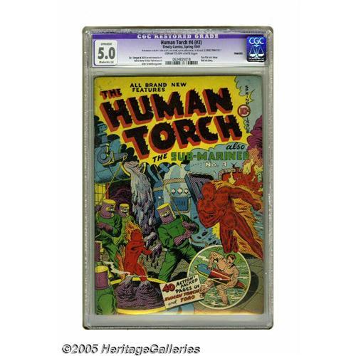 <B>The Human Torch #4 (#3) (Timely, 1941) CGC Apparent VG/FN 5.0 Moderate (A) Cream to off-white pages.</B></I> Many a perplexed comic fan will wonder why this comic is called #4 (#3) since the cover clearly says ""No. 3."" The answer is that the indicia call it number 4. The issue's got an Alex Schomburg cover, with interior art by Bill Everett, Carl Burgos and others. A text feature reveals the origin of the Patriot. CGC notes, ""Restoration includes: color touch, tear seals, spine splits sealed, reinforced (2 edges trimmed)."" Overstreet 2005 GD 2.0 value = $423; VG 4.0 value = $846; FN 6.0 value = $1,269. <BR><BR><B>Important notice:</B> Heritage usually auctions material at the rate of 200-250 lots per hour. On some occasions eBay Live bid software or the Internet may not be able to keep up with the pace of the auction. We recommend placing a realistic absentee bid now as insurance to avoid disappointment. Occasionally the auctioneer may eliminate or reject an eBay Live bid, and the auctioneer may also reopen a lot after the close of the eBay live bidding (usually because we missed an audience bid), and may reject your bid even if it shows you as the winning bidder. By bidding via eBay Live, you agree that Heritage may award the lot to another bidder at its sole discretion under the circumstances described above or any other reasonable circumstances. Since eBay bids are not shown to us until we open the lot on the floor, we treat those bids just like floor bids. In most cases the floor responds before the eBay bid is presented to us, due to Internet lag time, so for consistency we have made it a policy that floor bids are always considered first over tie eBay live bids. Also please note that all Heritage lots purchased through eBay Live carry a 20% Buyer's Premium. Please make sure you read the Terms and Conditions before you bid. This lot is being auctioned in conjunction with a live floor auction by Heritage Galleries & Auctioneers. All final auction and invo