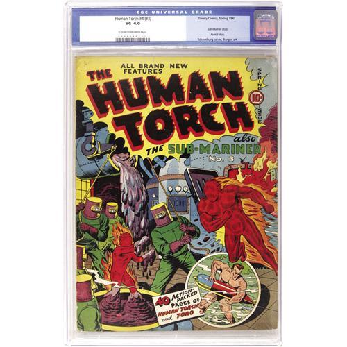<B>The Human Torch #4 (#3) (Timely, 1941) CGC VG 4.0 Cream to off-white pages.</B></I> The Patriot made his first appearance in this issue (a text feature reveals the character's origin). The issue's got an Alex Schomburg cover, with interior art by Bill Everett, Carl Burgos and others. By the way, you might be wondering why this comic is called #4 (#3) since the cover clearly says "No. 3"... the answer is that the indicia call it number 4. This one's got everything the Timely fan looks for! Overstreet 2006 VG 4.0 value = $846. CGC census 5/06: 5 in 4.0, 19 higher. <I>From the collection of Patrick Marchbanks.</B></I> <BR><BR><B>Important notice:</B> Heritage usually auctions material at the rate of 200-250 lots per hour. On some occasions eBay Live bid software or the Internet may not be able to keep up with the pace of the auction. We recommend placing a realistic absentee bid now as insurance to avoid disappointment. Occasionally the auctioneer may eliminate or reject an eBay Live bid, and the auctioneer may also reopen a lot after the close of the eBay live bidding (usually because we missed an audience bid), and may reject your bid even if it shows you as the winning bidder. By bidding via eBay Live, you agree that Heritage may award the lot to another bidder at its sole discretion under the circumstances described above or any other reasonable circumstances. Since eBay bids are not shown to us until we open the lot on the floor, we treat those bids just like floor bids. In most cases the floor responds before the eBay bid is presented to us, due to Internet lag time, so for consistency we have made it a policy that floor bids are always considered first over tie eBay live bids. Also please note that all Heritage lots purchased through eBay Live carry a 22.5% Buyer's Premium. Please make sure you read the Terms and Conditions before you bid. This lot is being auctioned in conjunction with a live floor auction by Heritage Auction Galleries. All final auction and invoice information will be supplied by Heritage Auction Galleries, and all other information should be considered preliminary. Lot:41001 <BR><BR><B>Winning Notification and Billing:</B> After the FINAL session in this auction is complete, Heritage will send e-mail and snail mail invoices. This process normally takes several days. All final auction and invoice information will be supplied by Heritage Auction Galleries, and all other information should be considered preliminary. <BR><BR>This auction will be conducted on a live auction floor and over the Internet through eBay Live. If you choose to place an absentee bid, please take a moment to <font color='#0000ff'><u><a href='http://pages.ebay.com/liveauctions/help/before/laabsentee.html'>learn how eBay Live absentee bidding works</a></u></font><font color='#000000'>