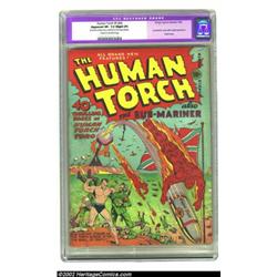 The Human Torch #5 (#4) (Timely, 1941) CGC Apparent VF- 7.5 Slight (A) Cream to off-white pages. From the Schomburg Subby-gets-medieval-on-Nazis cover to interior features, the Human Torch, the Sub-Mariner (with an Angel appearance), and the Patriot, this is classic wartime Timely. The cover is the first Nazi war cover for the title. The hidden restoration is described by CGC thusly, "Restoration includes: piece re-attached to 25th page with glue." Some bidders may be put off by the purple label, enabling your reasonable winning bid. Overstreet 2002 VF 8.0 value = $1,875. Important notice: We expect to be auctioning lots at the rate of 200-250 per hour. Sometimes eBay Premier live bid software cannot keep up with that pace, so we strongly recommend that you place a realistic proxy bid now as insurance to avoid disappointment. Also please note that all Heritage/CAA lots purchased through eBay Premier carry a 20% Buyer's Premium. Please make sure you read the Terms and Conditions.