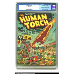 The Human Torch #5 (Timely, 1941) CGC VF+ 8.5 Off-white pages. The Human Torch and the Sub-Mariner take time out from fighting Nazis and other inferior foes to engage in beating the daylights out of each other in true Marvel fashion. Who else you gonna hone your fighting skills upon but another superhero? It's a 60-page epic battle, and it starts with an Alex Schomburg cover. This copy has earned the highest grade of any issue #5 CGC has reviewed to date. Only three other unrestored copies have managed as high a grading as Fine. Only serious bidders with great taste and sparkling personalities deserve this book! Overstreet 2002 VF 8.0 value = $3,000; NM 9.4 value = $6,000. Important notice: We expect to be auctioning lots at the rate of 200-250 per hour. Sometimes eBay Premier live bid software cannot keep up with that pace, so we strongly recommend that you place a realistic proxy bid now as insurance to avoid disappointment. Also please note that all Heritage/CAA lots purchased through eBay Premier carry a 20% Buyer's Premium. Please make sure you read the Terms and Conditions.