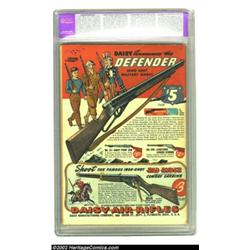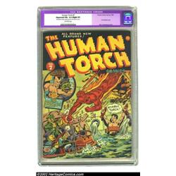 The Human Torch #7 (Timely, 1942) CGC Apparent FN+ 6.5 Slight (P) Off-white pages. Toro and Bucky were competing vigorously for the prestigious "Sidekick Most Often In Bondage On An Alex Schomburg Cover" Award in the early 1940s, and here Toro helplessly watches the Human Torch take care of his toothy Oriental tormenters in the first Japanese war cover of the title. Very minor restoration work on this copy is described by CGC as "small amount of color touch on cover." In this case the "Apparent" grade is pretty close to the real thing, which makes this a book a potential Best Buy. Overstreet 2002 FN 6.0 value = $654 Important notice: We expect to be auctioning lots at the rate of 200-250 per hour. Sometimes eBay Premier live bid software cannot keep up with that pace, so we strongly recommend that you place a realistic proxy bid now as insurance to avoid disappointment. Also please note that all Heritage/CAA lots purchased through eBay Premier carry a 20% Buyer's Premium. Please make sure you read the Terms and Conditions.