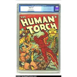 The Human Torch #8 (Timely, 1942) CGC FN/VF 7.0 Off-white to white pages. When not confronted by a common enemy, the Human Torch and Sub-Mariner proved to be as close as brothers, pummeling each other in "boys will be boys" play from time to time. This is one of those times with Alex Schomburg chronicling the action. Bright colors and pages strain to earn this copy a higher grade, but (mostly subtle) wear around the edges holds it back. But then CGC has awarded a grade higher than Very Fine to only three copies, so this is a very respectable representative. Overstreet 2002 FN 6.0 value = $924; VF 8.0 value = $1,927. Important notice: We expect to be auctioning lots at the rate of 200-250 per hour. Sometimes eBay Premier live bid software cannot keep up with that pace, so we strongly recommend that you place a realistic proxy bid now as insurance to avoid disappointment. Also please note that all Heritage/CAA lots purchased through eBay Premier carry a 20% Buyer's Premium. Please make sure you read the Terms and Conditions.