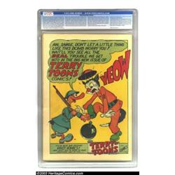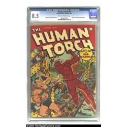 The Human Torch #8 (Timely, 1942) CGC VF+ 8.5 Off-white to white pages. The Human Torch and his underwater nemesis, the Sub-Mariner are at it again on this great World War II cover by Alex Schomburg. They duke it out for 52 pages inside these covers, and their antics will continue in issue #10. Elsewhere, there's a Basil Wolverton story, just in case you need some comic relief. And while there may be three or four higher-graded copies in CGC's current census list, this copy looks nice enough for even picky collectors of Golden Age Timelys. Overstreet 2003 VF 8.0 value = $2,000; VF/NM 9.0 value = $3,000. Important notice: Heritage usually auctions material at the rate of 200-250 lots per hour. On some occasions eBay Live bid software or the Internet may not be able to keep up with the pace of the auction. We recommend placing a realistic absentee bid now as insurance to avoid disappointment. Occasionally the auctioneer may eliminate or reject an eBay Live bid, and the auctioneer may also reopen a lot after the close of the eBay live bidding (usually because we missed an audience bid), and may reject your bid even if it shows you as the winning bidder. By bidding via eBay Live, you agree that Heritage may award the lot to another bidder at its sole discretion under the circumstances described above or any other reasonable circumstances. Also please note that all Heritage lots purchased through eBay Live carry a 20% Buyer's Premium. Please make sure you read the Terms and Conditions before you bid.